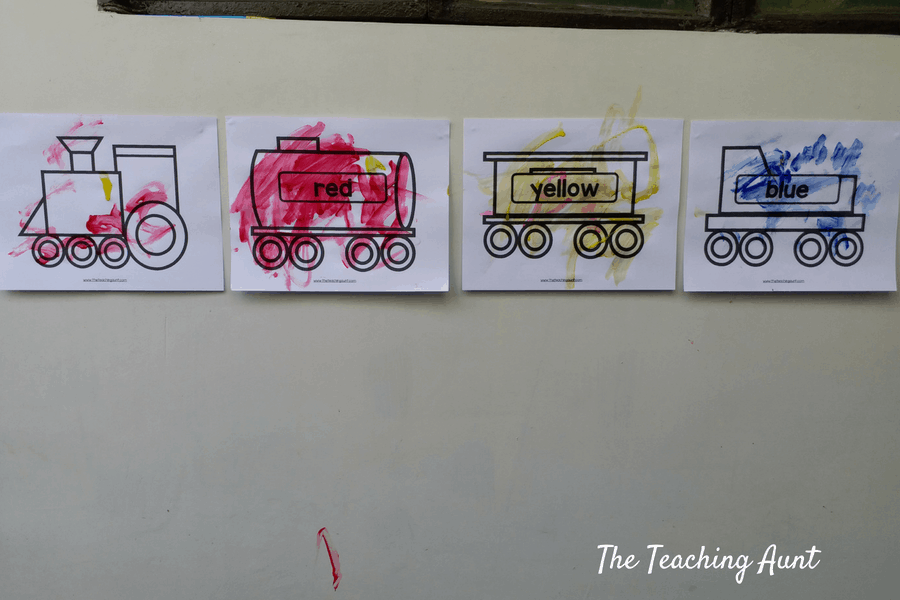 Using the printables, I printed the train set with color words and asked my nephew to paint them.