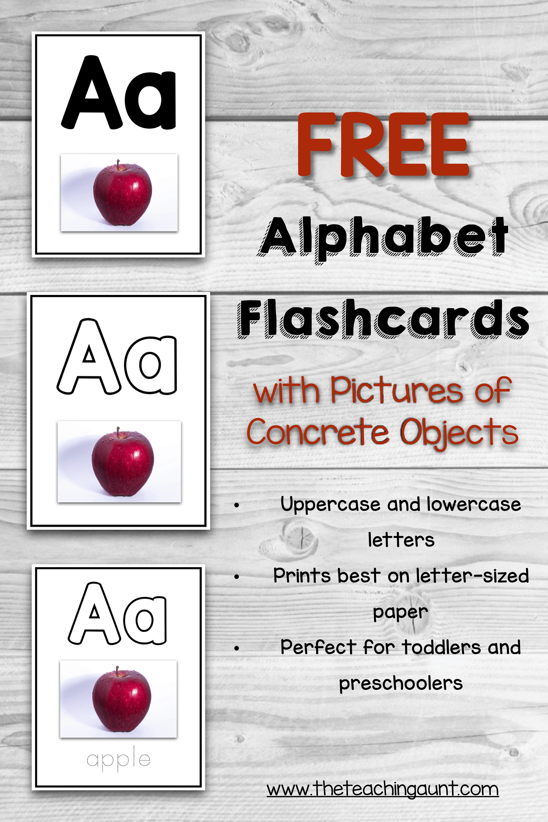 Help your child learn about the letters through these Alphabet Flashcards with Pictures of Concrete Objects from The Teaching Aunt.