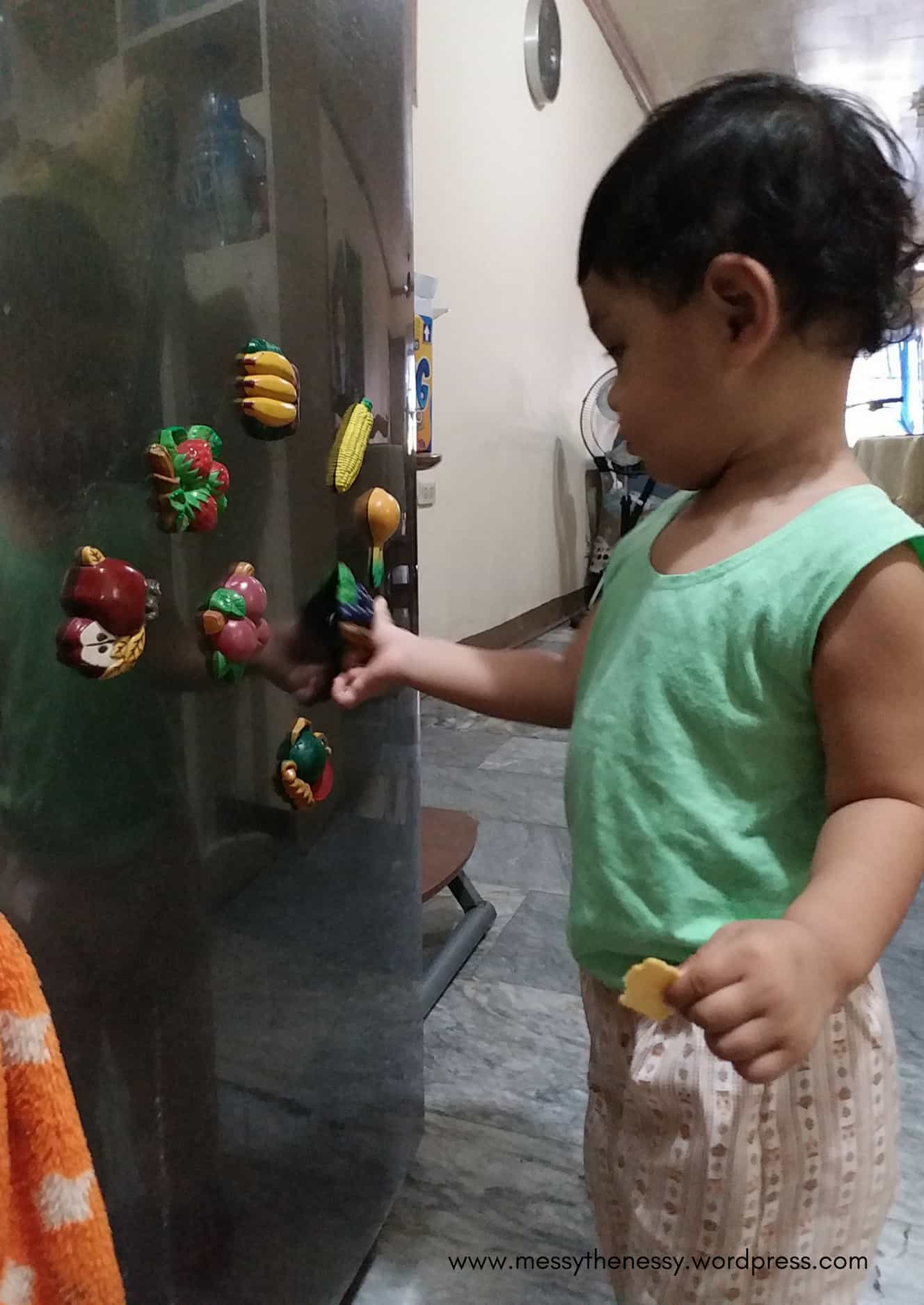 For this activity, all you need to do is lower the fridge magnets to your child’s level, and let him/her move the magnet around on the fridge door.